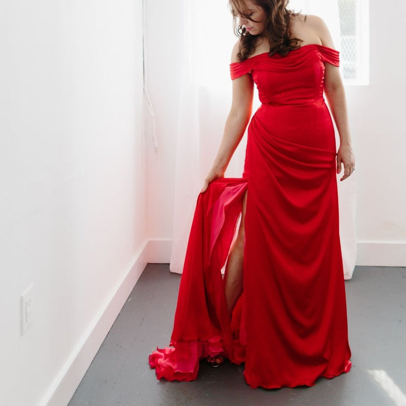 A custom gown balancing engineered structure through the bodice with fluid movement and bold color in the skirt. Designed to feel powerful, modern and unmistakably alive in motion.